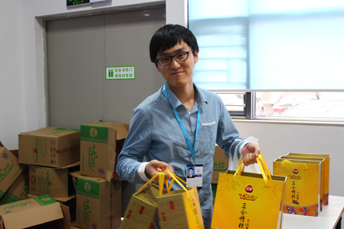 菖蒲高懸飲雄黃,竹葉紅豆粽子香,端午臨近,濃濃的節日氣氛彌漫華訊方舟,6月6日下午,由公司行政部精心準備的一箱箱“三全龍舟粽”抵達公司階梯會議廳,各部們派代表領取集團送給員工們的節日禮物,讓他們感受到家的溫暖,一箱箱龍舟粽,一張張開懷笑臉,粽香情更濃。
